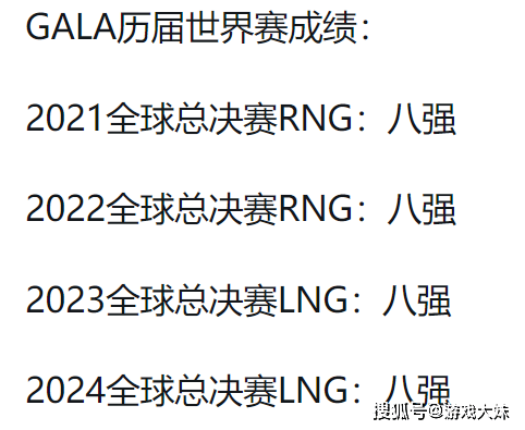 不过,纪录的另一面,也藏着尴尬的现实,过去四次世界赛,GALA所在的队伍都止步八强——2021年、2022年随RNG连续两年折戟,2023、2024年在LNG依然未能突破“八强魔咒”,数据背后,既有对手强大的原因,也有队伍整体实力不足的无奈,但无论如何,GALA始终未能将个人的稳定发挥,转化为队伍走得更远的资本。
