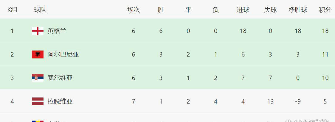 作为传统豪强,英格兰被分在K组,和塞尔维亚、阿尔巴尼亚、拉脱维亚、安道尔同处一组。相较于意大利逐渐式微,英格兰在世预赛中表现出色,前五轮便取得15分稳居小组榜首,领先阿尔巴尼亚6分和塞尔维亚7分,晋级形势十分乐观。