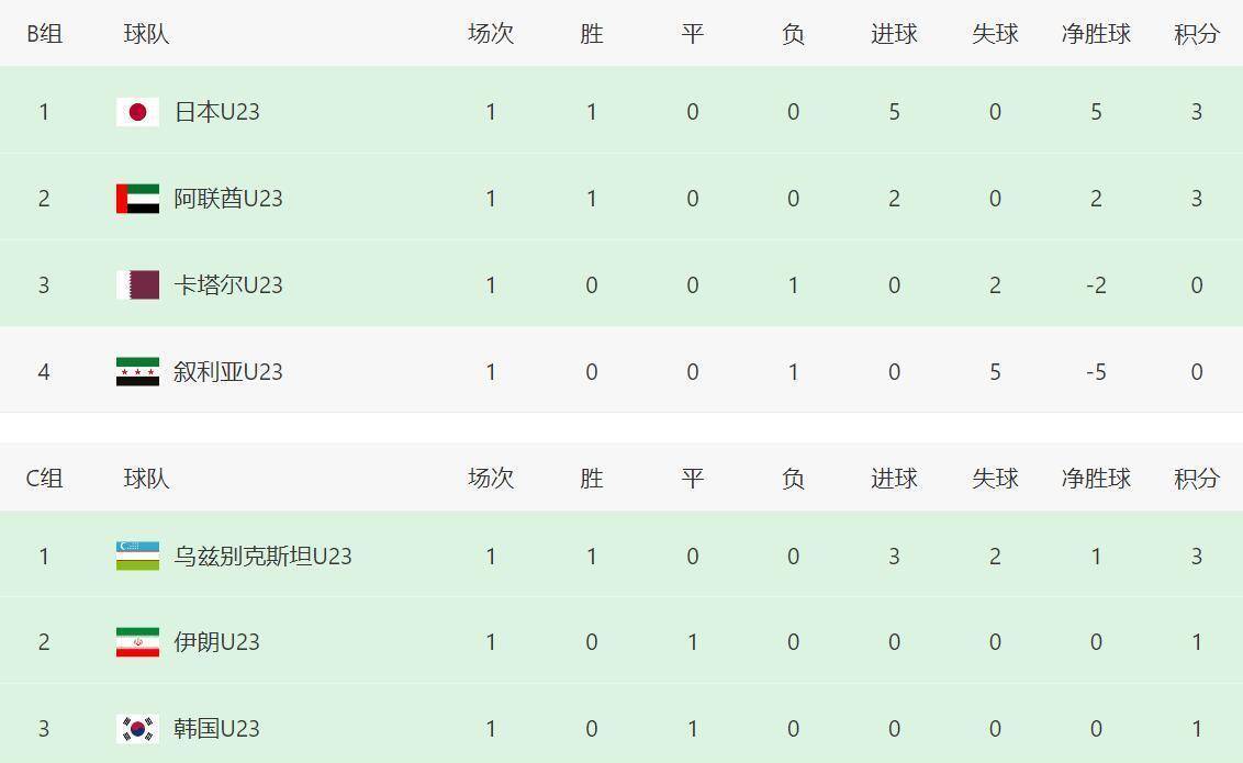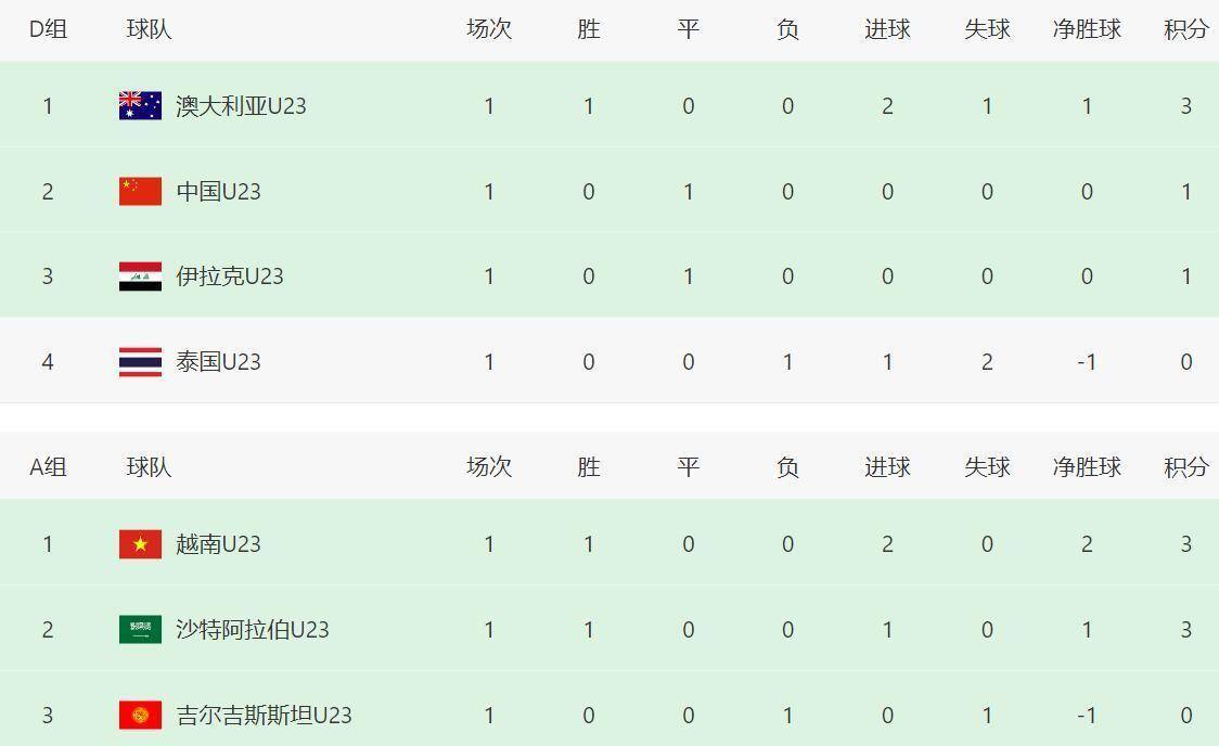 两场比赛结束后,D组积分榜如下:澳大利亚队凭借逆转取胜,积三分排名第一;中国队和伊拉克队各积一分,中国队凭借公平竞赛积分的优势(黄牌数更少),暂时排名第二;泰国队则因失利和红牌垫底。