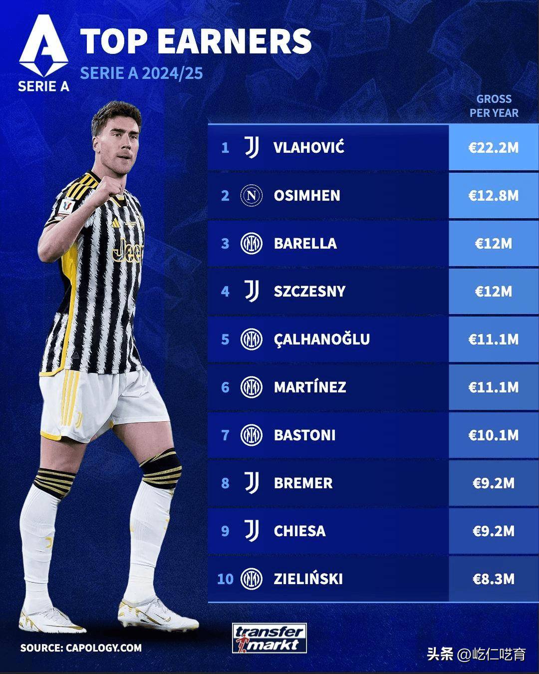 24/25、即上赛季开打前,来自于德转的统计显示,尤文的塞尔维亚前锋弗拉霍维奇,以2220万欧元的年薪高居意甲第一而遥遥领先于其他球员。