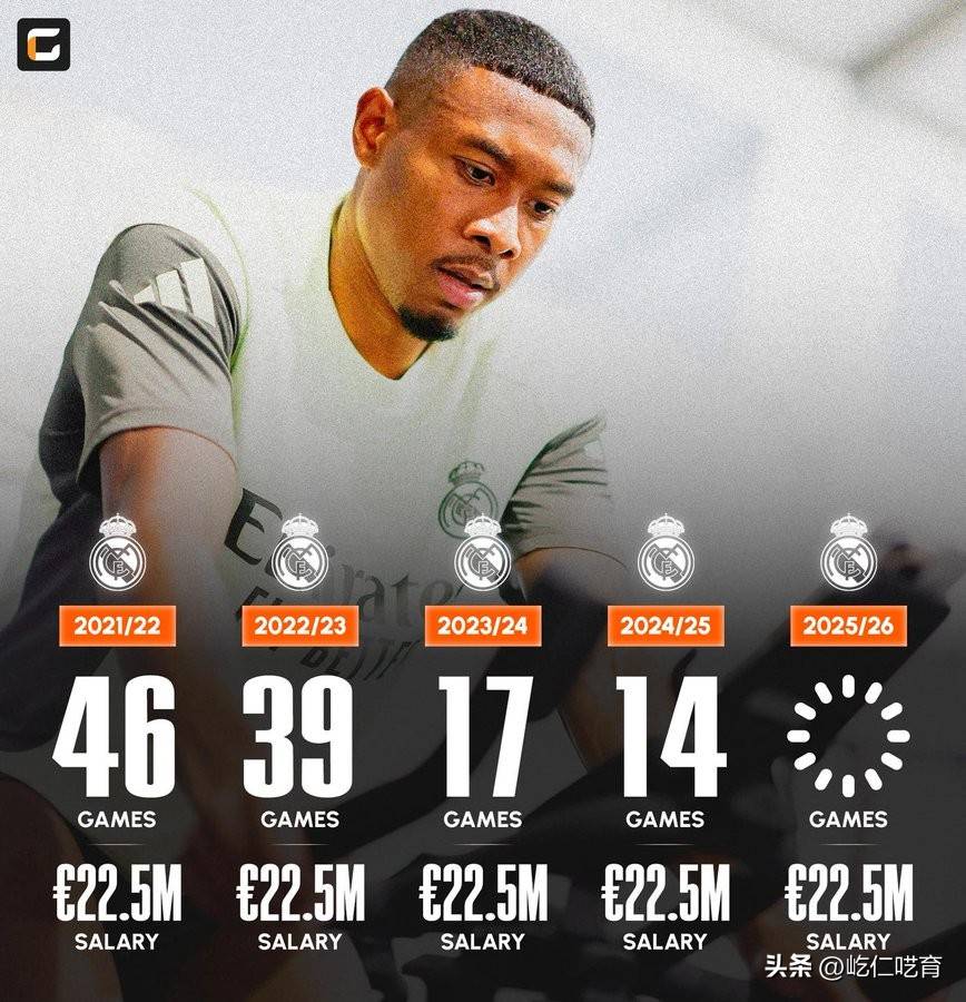 去年夏窗的7月30日,IGScore就对于皇马的奥地利球星阿拉巴的年薪和出场数据进行了统计。这位在2021年夏窗以免签身份从拜仁加盟的球员,因为签字费的平摊,也令其每年在皇马可以领到高达2250万欧元的年薪(目前皇马队内仅次于姆巴佩的第二高薪)!