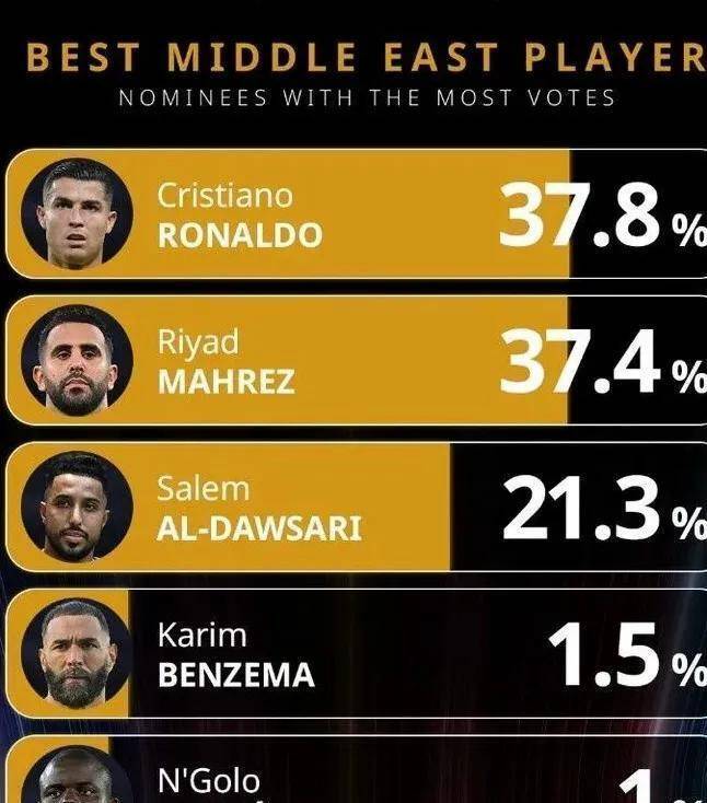 这场投票的结果展现了中东足坛顶级球员竞争的激烈程度。 除了C罗和马赫雷斯之外,其他候选人的得票率均未超过2%。 多萨里以21.3%的得票率位列第三,本泽马和坎特分别以1.5%和1%的得票率排在第四和第五位。